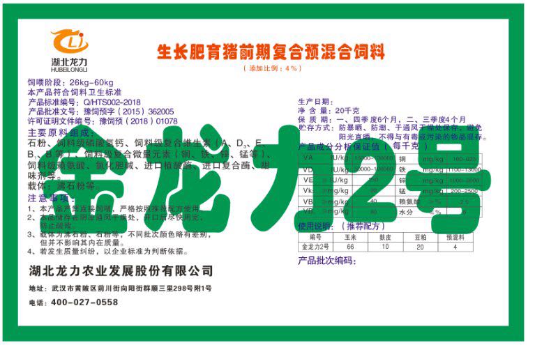 湖北龍力農(nóng)業(yè)發(fā)展股份有限公司坐落于武漢市黃陂區(qū)前川街向陽街群順三里298號(hào)附1號(hào)。公司成立于2014年6月,公司自成立以來把“創(chuàng)全球最大養(yǎng)豬綜合服務(wù)”為企業(yè)愿景。致力于打造教保料品牌”作為公司發(fā)展的明確目標(biāo)。公司一直致力于豬營養(yǎng)的研究和開發(fā),積極與國內(nèi)外高校和科研機(jī)構(gòu)合作,推廣養(yǎng)豬技術(shù)、動(dòng)物營養(yǎng)新概念,向世界農(nóng)牧企業(yè)學(xué)習(xí)與合作。公司采用國內(nèi)先進(jìn)的生產(chǎn)工藝,選擇高精度電子配料秤,高均勻度、無殘留混合機(jī)等先進(jìn)設(shè)備....